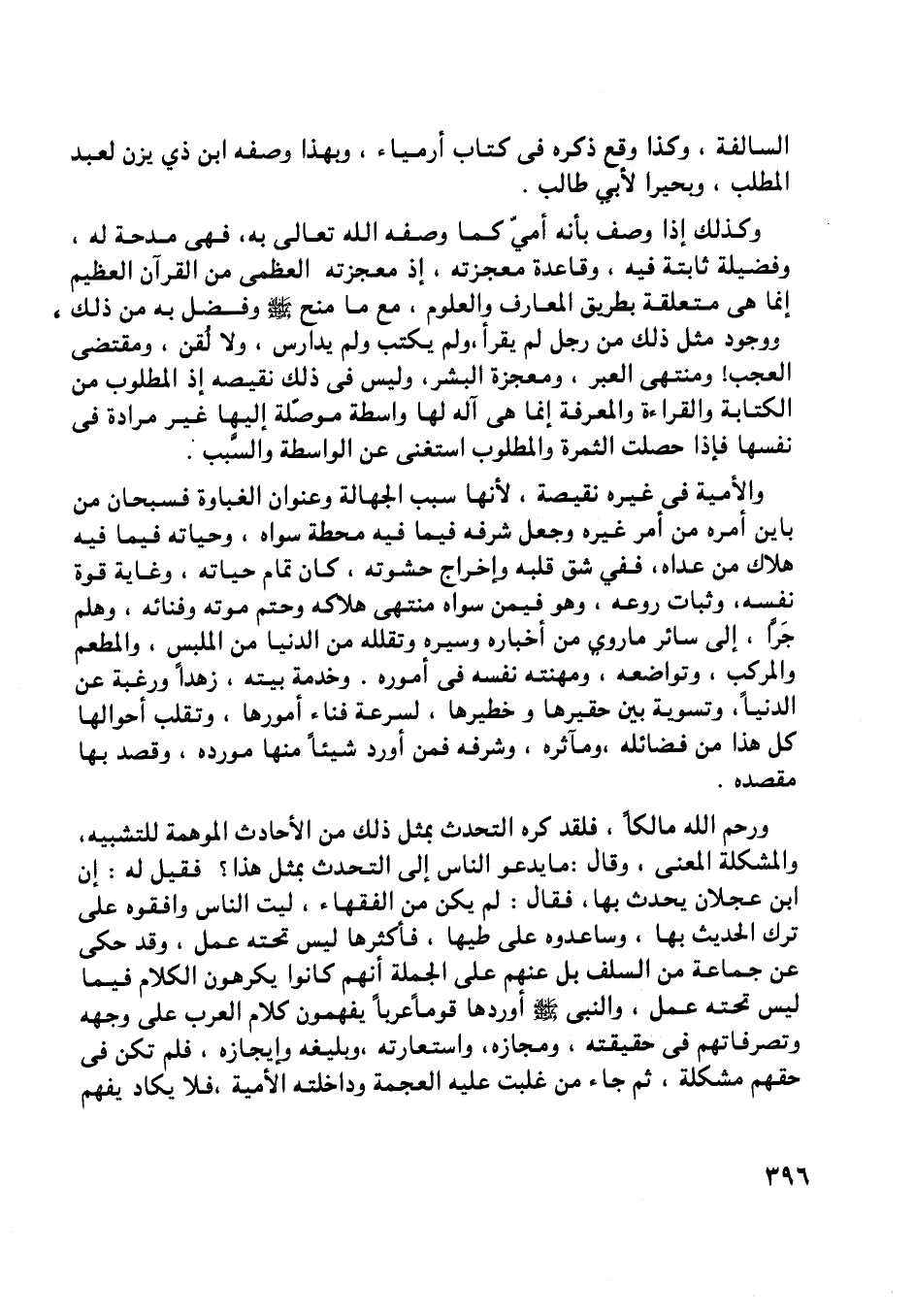 والأمية في غيره نقيصة، لأنها سبب الجهالة وعنوان الغباوة فسبحان من باين أمره من أمر غيره وجعل شرفه فيما فيه محطة سواه، وحياته فيما فيه هلاك من عداه، ففي شق قلبه وإخراج حشوته، كان تمام حياته، وغاية قوة نفسه، وثبات روعه، وهو فيمن سواه منتهى هلاكه وحتم موته وفنائه، وهلم جرّا، إلى سائر ما روي من أخباره وسيره وتقلّله من الدنيا من الملبس، والمطعم والمركب، وتواضعه، ومهنته نفسه في أموره. وخدمة بيته، زهدا ورغبة عن الدنيا، وتسوية بين حقيرها وخطيرها، لسرعة فناء أمورها، وتقلب أحوالها كل هذا من فضائله، ومآثره، وشرفه فمن أورد شيئا منها مورده، وقصد بها مقصده.