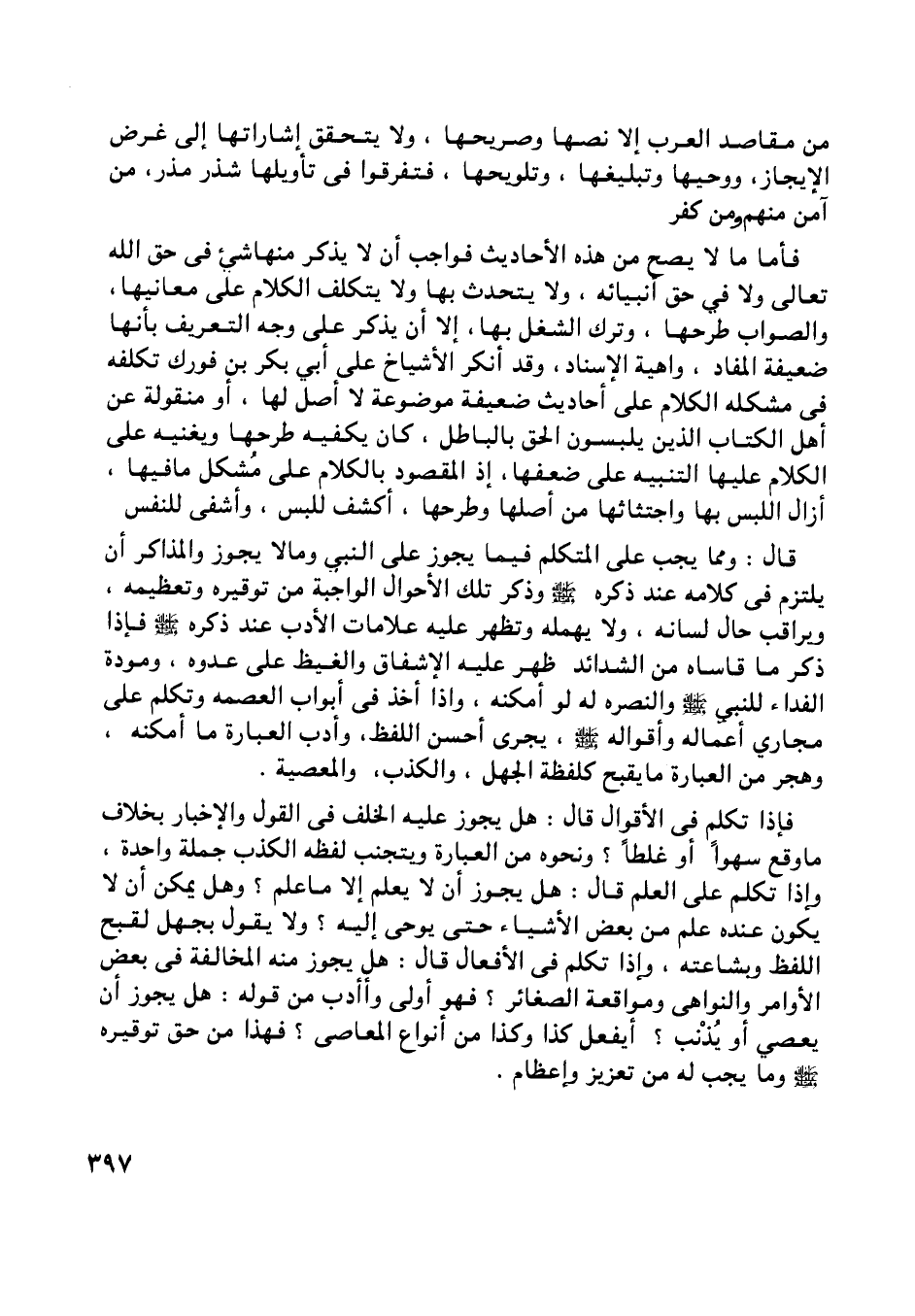 قال: ومما يجب على المتكلم فيما يجوز على النبي وما لا يجوز والمذاكر أن يلتزم في كلامه عند ذكره صلّى اللَّه عليه وسلّم وذكر تلك الأحوال الواجبة من توقيره وتعظيمه، ويراقب حال لسانه، ولا يهمله وتظهر عليه علامات الأدب عند ذكره صلّى اللَّه عليه وسلّم فإذا ذكر ما قاساه من الشدائد ظهر عليه الإشفاق والغيظ على عدوه، ومودة الفداء للنّبيّ صلّى اللَّه عليه وسلّم والنصرة له لو أمكنه، وإذا أخذ في أبواب العصمة وتكلم على مجاري أعماله وأقواله صلّى اللَّه عليه وسلّم، يجرى أحسن اللفظ، وأدب العبارة ما أمكنه، وهجر من العبارة ما يقبح كلفظة الجهل، والكذب، والمعصية.