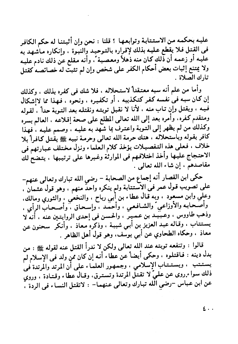 وحكى أيضا عن عطاء أنه إن كان ممن ولد في الإسلام لم يستتب، ويستتاب الإسلامي، وجمهور العلماء على أن المرتد والمرتدة في ذلك سواء