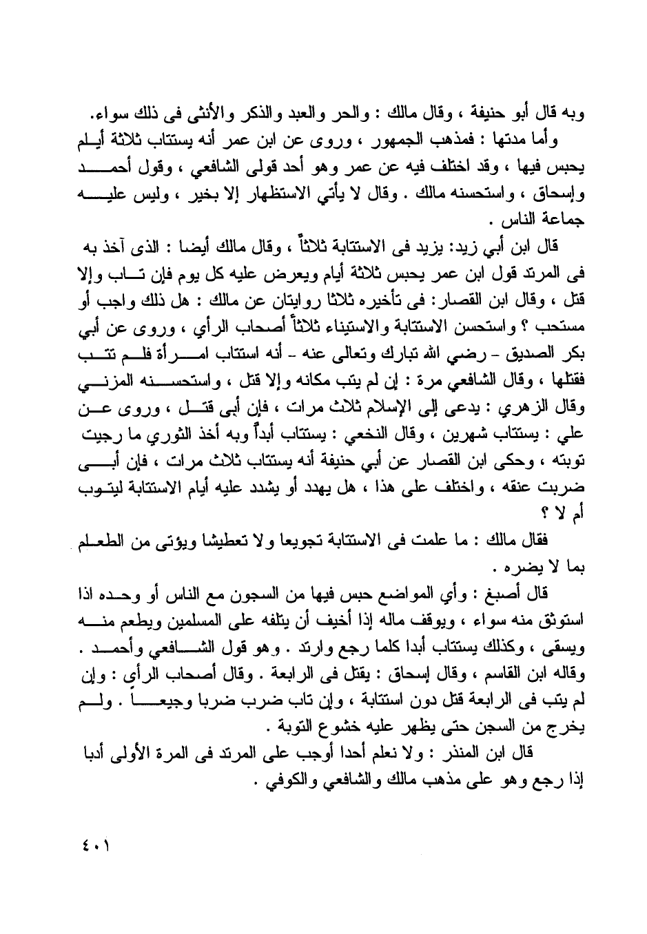 قال ابن أبي زيد: يزيد في الاستتابة ثلاثا، وقال مالك أيضا: الّذي آخذ به في المرتد قول ابن عمر يحبس ثلاثة أيام ويعرض عليه كل يوم فإن تاب وإلا قتل، وقال ابن القصار: في تأخيره ثلاثا روايتان عن مالك: هل ذلك واجب أو مستحب؟ واستحسن الاستتابة والاستيناء ثلاثا أصحاب الرأي، وروى عن أبي بكر الصديق- رضي اللَّه تبارك وتعالى عنه- أنه استتاب امرأة فلم تتب فقتلها، وقال الشافعيّ مرة: إن لم يتب مكانه وإلا قتل، واستحسنه المزني وقال الزهري: يدعى إلى الإسلام ثلاث مرات، فإن أبى قتل،