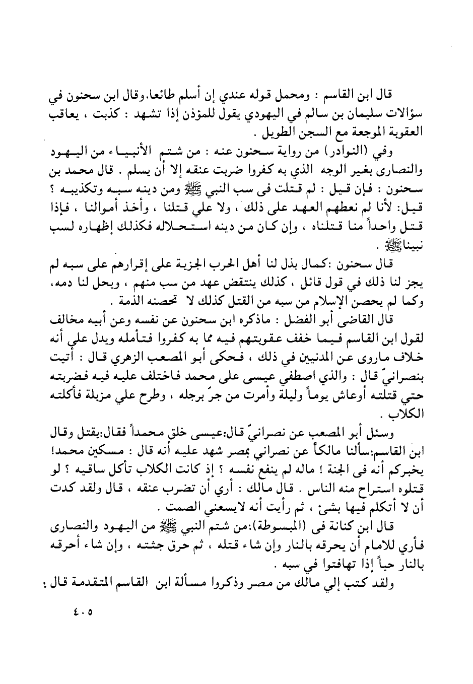وسئل أبو المصعب عن نصرانيّ قال: عيسى خلق محمدا فقال: يقتل وقال ابن القاسم: سألنا مالكا عن نصراني بمصر شهد عليه أنه قال: مسكين محمد! يخبركم أنه في الجنة! ما له لم ينفع نفسه؟ إذ كانت الكلاب تأكل ساقيه؟ لو قتلوه استراح منه الناس. قال مالك: أري أن تضرب عنقه، قال ولقد كدت أن لا أتكلم فيها بشيء، ثم رأيت أنه لا يسعني الصمت.