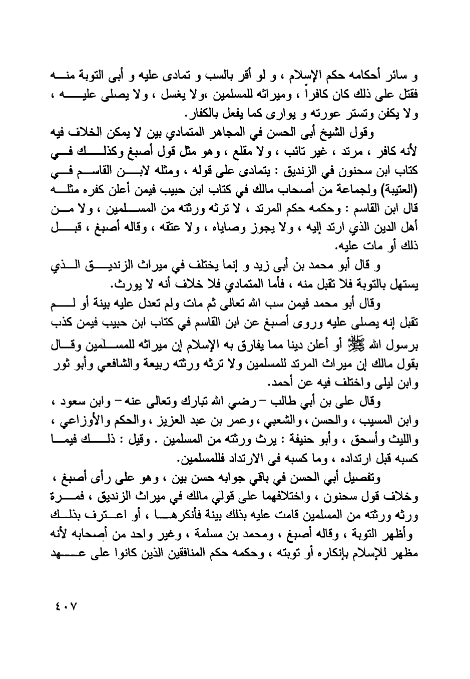 وتفصيل أبي الحسن في باقي جوابه حسن بين، وهو على رأى أصبغ، وخلاف قول سحنون، واختلافهما على قولي مالك في ميراث الزنديق، فمرة ورثه ورثته من المسلمين قامت عليه بذلك بينة فأنكرها، أو اعترف بذلك وأظهر التوبة، وقاله أصبغ، ومحمد بن مسلمة، وغير واحد من أصحابه لأنه مظهر للإسلام بإنكاره أو توبته، وحكمه حكم المنافقين الذين كانوا على عهد