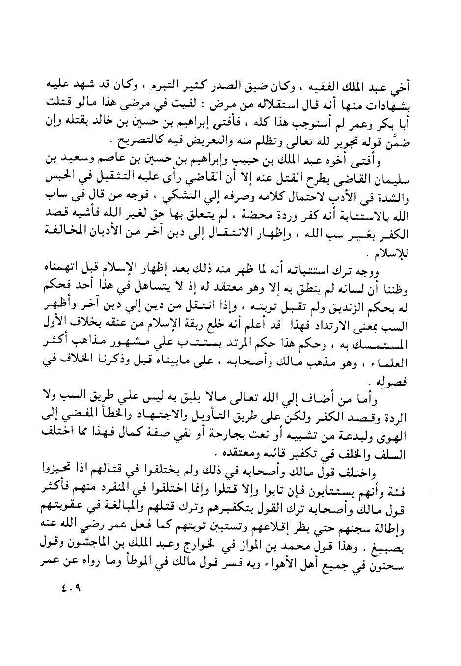 أخي عبد الملك الفقيه، وكان ضيق الصدر كثير التبرم، وكان قد شهد عليه بشهادات منها أنه قال استقلاله من مرض: لقيت في مرضي هذا ما لو قتلت أبا بكر وعمر لم أستوجب هذا كله، فأفتى إبراهيم بن حسين بن خالد بقتله وإن ضمّن قوله تجوير للَّه تعالى وتظلم منه والتعريض فيه كالتصريح.