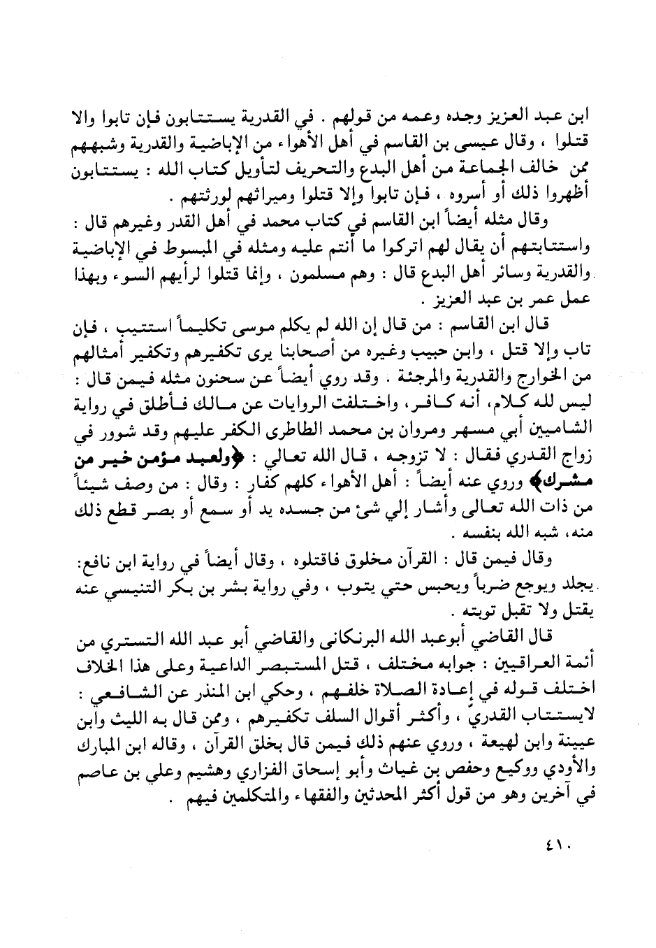 ابن عبد العزيز وجده وعمه من قولهم. في القدرية يستتابون فإن تابوا وإلا قتلوا، وقال عيسى بن القاسم في أهل الأهواء من الإباضية والقدرية وشبههم ممن خالف الجماعة من أهل البدع والتحريف لتأويل كتاب اللَّه: يستتابون أظهروا ذلك أو أسروه، فإن تابوا وإلا قتلوا وميراثهم لورثتهم.