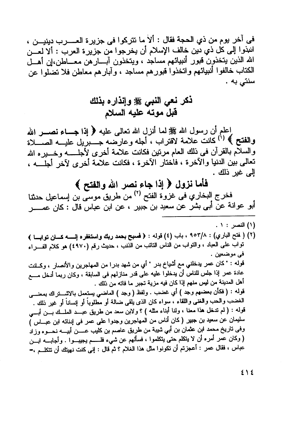 في آخر يوم من ذي الحجة فقال: ألا ما تتركوا في جزيرة العرب دينين، انبذوا إلى كل ذي دين خالف الإسلام أن يخرجوا من جزيرة العرب: ألا لعن اللَّه الذين يتخذون قبور أنبيائهم مساجد، ويتخذون آبارهن معاطن، إن أهل الكتاب خالفوا أنبيائهم واتخذوا قبورهم مساجد، وآبارهم معاطن فلا تضلوا عن سنتي به.