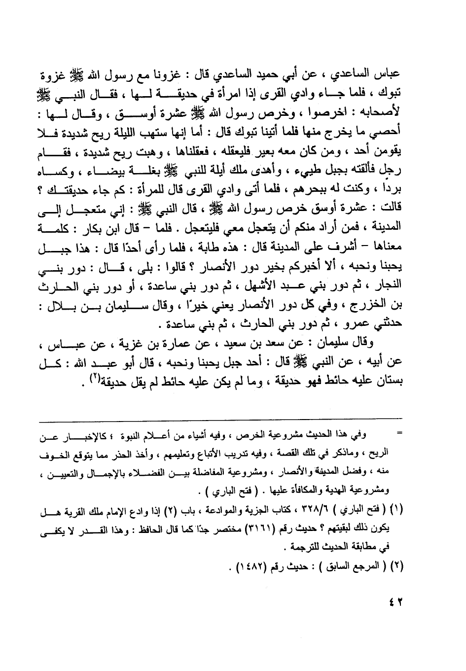 [ (1) ] (فتح الباري) 6/ 328، كتاب الجزية والموادعة، باب (2) إذا وادع الإمام ملك القرية هل يكون ذلك لبقيتهم؟ حديث رقم (3161) مختصر جدا كما قال الحافظ: وهذا القدر لا يكفى في مطابقة الحديث للترجمة.