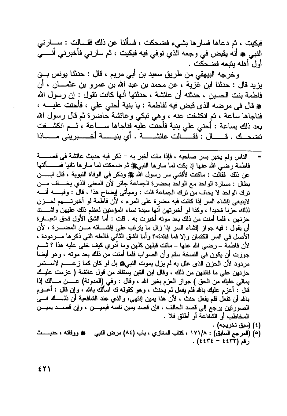 وخرجه البيهقي من طريق سعيد بن أبي مريم، قال: حدثنا يونس بن يزيد قال: حدثنا ابن غزية، عن محمد بن عبد اللَّه بن عمرو بن عثمان، أن فاطمة بنت الحسين، حدثته أن عائشة، حدثتها أنها كانت تقول: إن رسول اللَّه صلى اللَّه عليه وسلّم قال في مرضه الّذي قبض فيه لفاطمة: يا بنية أحني علي، فأحنت عليه، فناجاها ساعة، ثم انكشفت عنه، وهي تبكي وعائشة حاضرة ثم قال رسول اللَّه بعد ذلك بساعة: أحني علي بنية فأحنت عليه فناجاها ساعة، ثم انكشفت تضحك. قال: فقالت عائشة. أي بنية أخبرينى ماذا