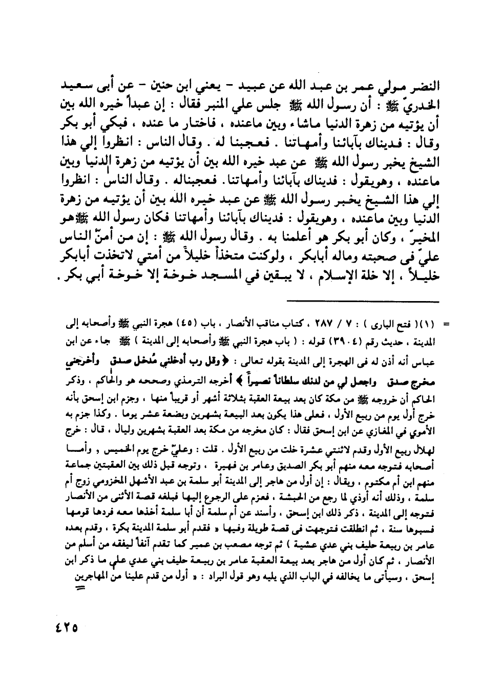 وخرج البخاري [ (1) ] ومسلم [ (2) ] والترمذي [ (3) ] ، من حديث مالك عن أبي النضر مولى عمر بن عبد اللَّه عن عبيد- يعني ابن حنين- عن أبى سعيد الخدريّ صلى اللَّه عليه وسلّم: أن رسول اللَّه صلى اللَّه عليه وسلّم جلس علي المنبر فقال: إن عبدا خيره اللَّه بين أن يؤتيه من زهرة الدنيا ما شاء وبين ما عنده، فاختار ما عنده، فبكى أبو بكر وقال: فديناك بآبائنا وأمهاتنا. فعجبنا له. وقال الناس: انظروا إلي هذا الشيخ يخبر رسول اللَّه صلى اللَّه عليه وسلّم عن عبد خيره اللَّه بين أن يؤتيه من زهرة الدنيا وبين ما عنده، وهو يقول: فديناك بآبائنا وأمهاتنا. فعجبنا له. وقال الناس: انظروا إلي هذا الشيخ يخبر رسول اللَّه صلى اللَّه عليه وسلّم عن عبد خيره اللَّه بين أن يؤتيه من زهرة الدنيا وبين ما عنده، وهو يقول: فديناك بآبائنا وأمهاتنا فكان رسول اللَّه صلى اللَّه عليه وسلّم هو المخيّر، وكان أبو بكر هو أعلمنا به. وقال رسول اللَّه صلى اللَّه عليه وسلّم: إن من أمنّ الناس عليّ في صحبته وماله أبا بكر، ولو كنت متخذا خليلا من أمتي لاتخذت أبا بكر خليلا، إلا خلة الإسلام، لا يبقين في المسجد خوخة إلا خوخة أبي بكر.