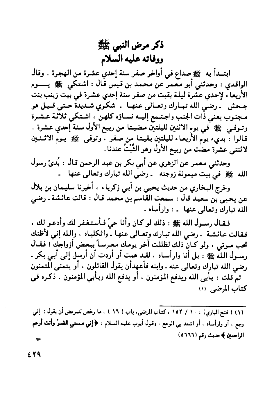 [ (1) ] (فتح الباري) : 10/ 152، كتاب المرضى، باب (16) ، ما رخص للمريض أن يقول: إني وجع، أو وا رأساه، أو اشتد بي الوجع، وقول أيوب عليه السلام: أَنِّي مَسَّنِيَ الضُّرُّ وَأَنْتَ أَرْحَمُ الرَّاحِمِينَ حديث رقم (5666) .