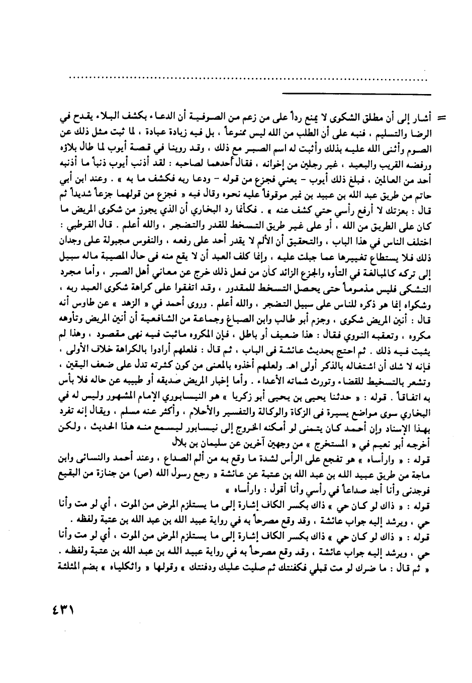 [ () ] أشار إلى أن مطلق الشكوى لا يمنع ردا على من زعم من الصوفية أن الدعاء بكشف البلاء يقدح في الرضا والتسليم، فنبه على أن الطلب من اللَّه ليس ممنوعا، بل فيه زيادة عبادة، لما ثبت مثل ذلك عن الصوم وأثنى اللَّه عليه بذلك وأثبت له اسم الصبر مع ذلك، وقد روينا في قصة أيوب لما طال بلاؤه ورفضه القريب والبعيد، غير رجلين من إخوانه، فقال أحدهما لصاحبه: لقد أذنب أيوب ذنبا ما أذنبه أحد من العالمين، فبلغ ذلك أيوب- يعني فجزع من قوله- ودعا ربه فكشف ما به» . وعند ابن أبي حاتم من طريق عبد اللَّه بن عبيد بن نمير موقوفا عليه نحوه وقال فيه «فجزع من قولهما جزعا شديدا ثم قال: بعزتك لا أرفع رأسي حتى كشف عنه» . فكأنما رد البخاري أن الّذي يجوز من شكوى المريض ما كان على الطريق من اللَّه، أو على غير طريق التسخط للقدر والتضجر، واللَّه أعلم. قال القرطبي: