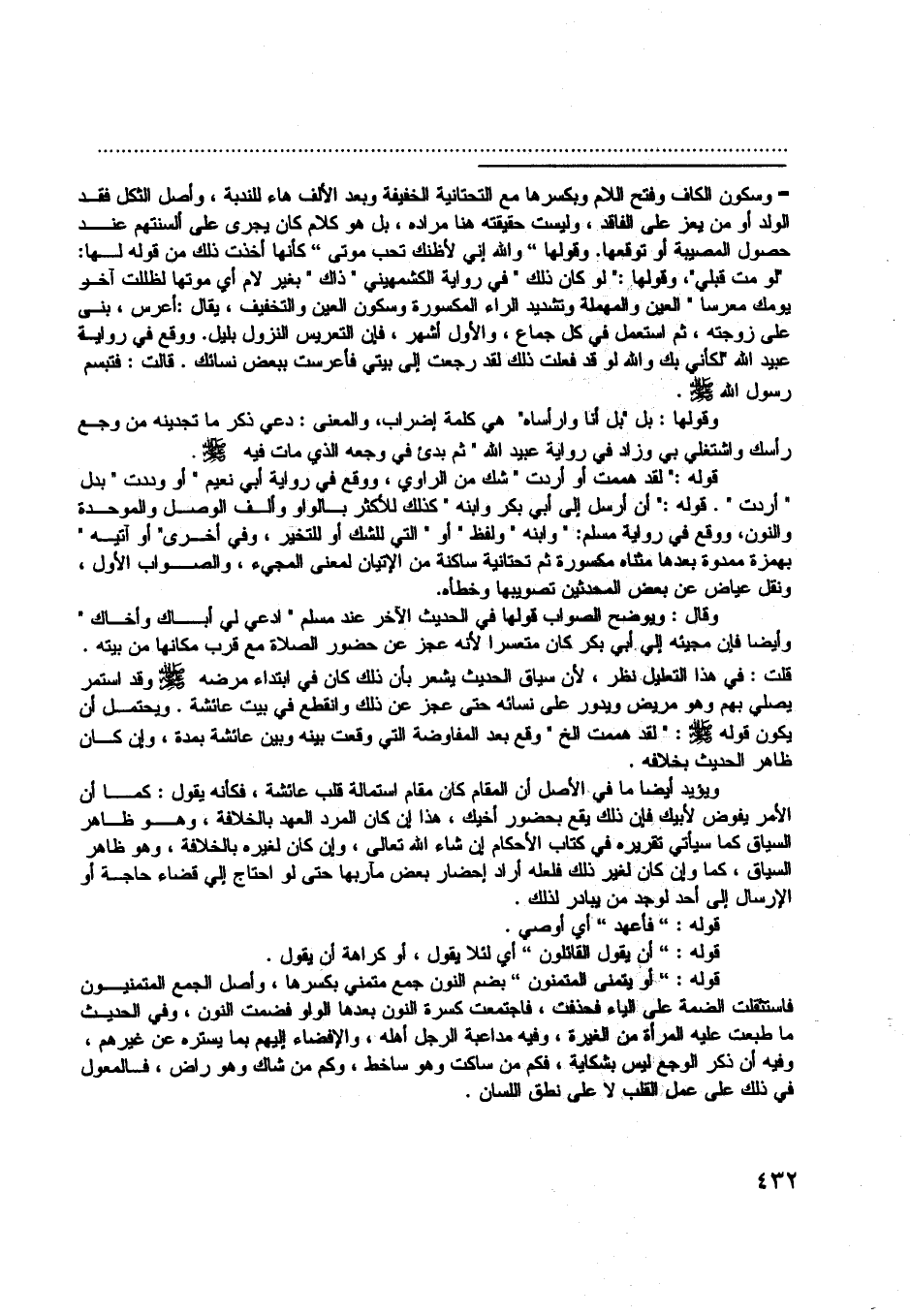 وقال: ويوضح الصواب قولها في الحديث الآخر عند مسلم «ادعي لي أباك وأخاك» وأيضا فإن مجيئه إلي أبي بكر كان متعسرا لأنه عجز عن حضور الصلاة مع قرب مكانها من بيته.