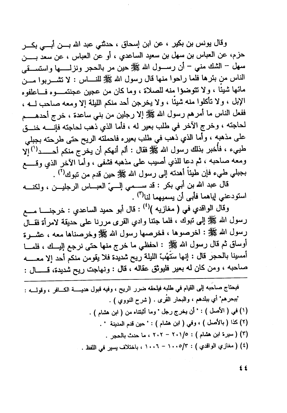 وقال يونس بن بكير، عن ابن إسحاق، حدثني عبد اللَّه بن أبي بكر حزم، عن العباس بن سهل بن سعيد الساعدي، أو عن العباس، عن سعد بن سهل- الشك مني- أن رسول اللَّه صلّى اللَّه عليه وسلّم حين مر بالحجر ونزلها واستسقى الناس من بئرها فلما راحوا منها قال رسول اللَّه صلّى اللَّه عليه وسلم للناس: لا تشربوا من مائها شيئا، ولا تتوضئوا منه للصلاة، وما كان من عجين عجنتموه فاعلفوه الإبل، ولا تأكلوا منه شيئا، ولا يخرجن أحد منكم الليلة إلا ومعه صاحب له، ففعل الناس ما أمرهم رسول اللَّه صلّى اللَّه عليه وسلّم إلا رجلين من بني ساعدة، خرج أحدهم لحاجته، وخرج الآخر في طلب بعير له، فأما الّذي ذهب لحاجته فإنه خنق على مذهبه، وأما الّذي ذهب في طلب بعيره فاحملته الريح حتى طرحته بجبلي طيِّئ، فأخبر بذلك رسول اللَّه صلّى اللَّه عليه وسلّم فقال: ألم أنهكم أن يخرج منكم أحد [ (1) ] إلا ومعه صاحبه، ثم دعا للذي أصيب على مذهبه فشفى، وأما الآخر الّذي وقع بجبلي طيِّئ فإن طيِّئا أهدته إلى رسول اللَّه صلّى اللَّه عليه وسلّم حين قدم من تبوك [ (2) ] .