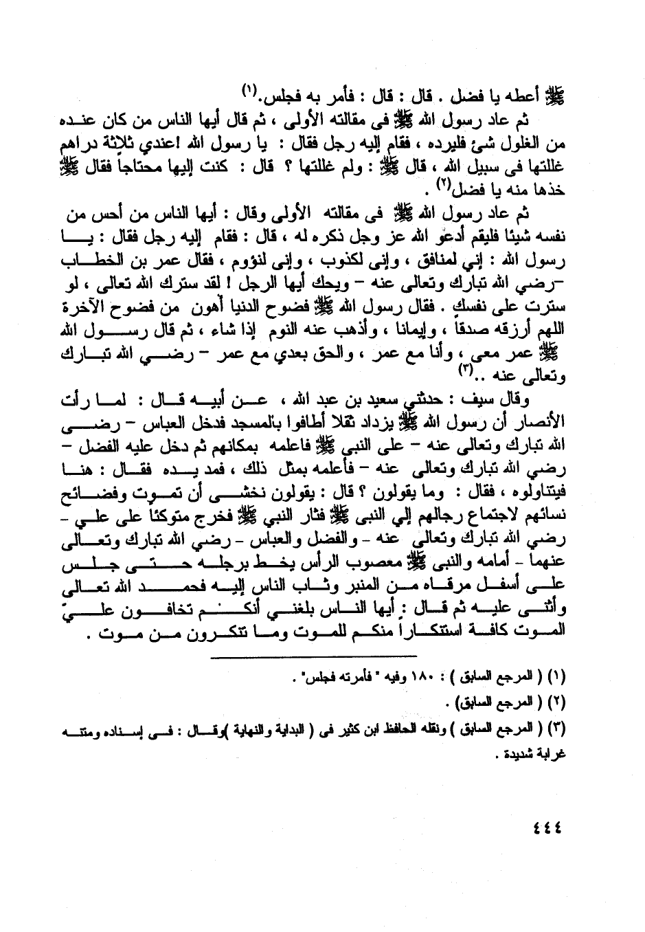 ثم عاد رسول اللَّه صلى اللَّه عليه وسلم في مقالته الأولى، ثم قال أيها الناس من كان عنده من الغلول شيء فليرده، فقام إليه رجل فقال: يا رسول اللَّه! عندي ثلاثة دراهم غللتها في سبيل اللَّه، قال صلى اللَّه عليه وسلم: ولم غللتها؟ قال: كنت إليها محتاجا فقال صلى اللَّه عليه وسلم خذها منه يا فضل [ (2) ] .