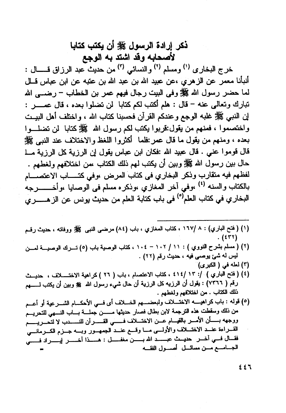 [ (4) ] (فتح الباري) /: 13/ 414، كتاب الاعتصام، باب (26) كراهية الاختلاف، حديث رقم (7366) : يقول أن الرزية كل الرزية أن حال شيء رسول اللَّه صلى اللَّه عليه وسلم وبين أن يكتب لهم ذلك الكتاب. من اختلافهم ولغطهم.