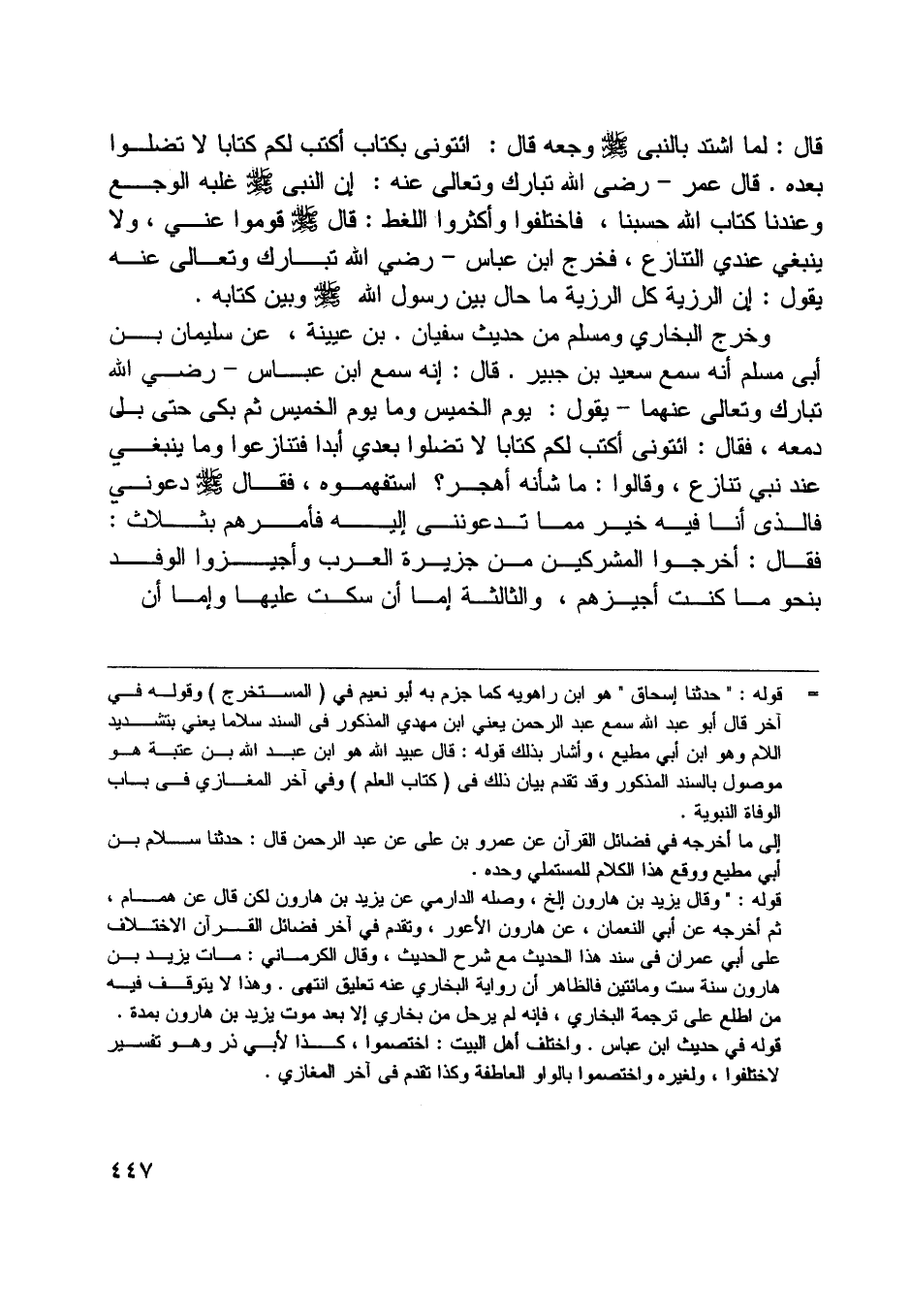 وخرج البخاري ومسلم من حديث سفيان. بن عيينة، عن سليمان بن أبي مسلم أنه سمع سعيد بن جبير. قال: إنه سمع ابن عباس- رضي اللَّه تبارك وتعالى عنهما- يقول: يوم الخميس وما يوم الخميس ثم بكى حتى بلى دمعه، فقال: ائتوني أكتب لكم كتابا لا تضلوا بعدي أبدا فتنازعوا وما ينبغي عند نبي تنازع، وقالوا: ما شأنه أهجر؟ استفهموه، فقال صلى اللَّه عليه وسلم دعوني فالذي أنا فيه خير مما تدعونني إليه فأمرهم بثلاث: