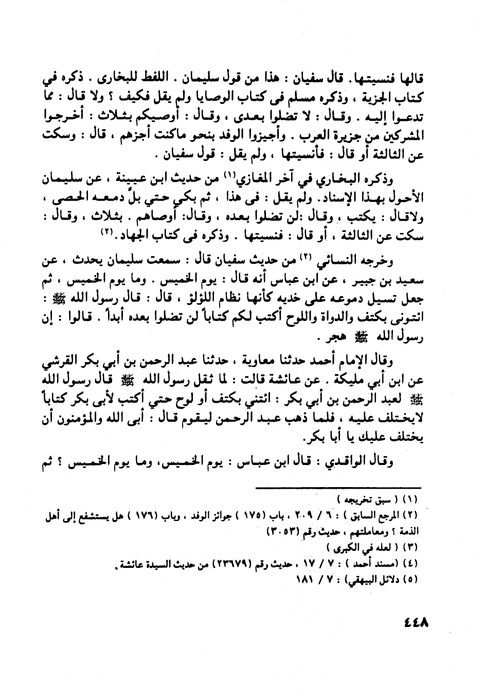 وخرجه النسائي [ (3) ] من حديث سفيان قال: سمعت سليمان يحدث، عن سعيد بن جبير، عن ابن عباس أنه قال: يوم الخميس. وما يوم الخميس، ثم جعل تسيل دموعه على خديه كأنها نظام اللؤلؤ، قال: قال رسول اللَّه صلى اللَّه عليه وسلم: