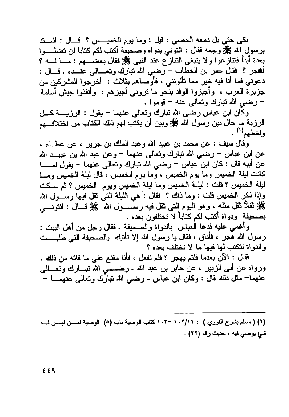 بكى حتى بل دمعه الحصى، قيل: وما يوم الخميس؟ قال: اشتد برسول اللَّه صلى اللَّه عليه وسلم وجعه فقال: ائتوني بدواة وصحيفة أكتب لكم كتابا لن تضلوا بعدة أبدا فتنازعوا ولا ينبغي التنازع عند النبي صلى اللَّه عليه وسلم فقال بعضهم: ما له؟
