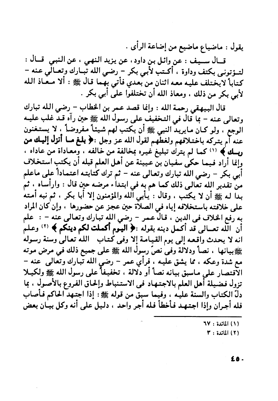 ثم نبه أمته على خلافته باستخلافه إياه في الصلاة حين عجز عن حضورها، وإن كان المراد به رفع الخلاف في الدين، قال عمر- رضي اللَّه تبارك وتعالى عنه-: علم أن اللَّه تعالى قد أكمل دينه بقوله: الْيَوْمَ أَكْمَلْتُ لَكُمْ دِينَكُمْ [ (2) ] وعلم انه لا يحدث واقعه إلى يوم القيامة إلا وفي كتاب اللَّه تعالى وسنة رسوله صلى اللَّه عليه وسلم بيانها، نصا ودلالة وفي نصّ رسول اللَّه صلى اللَّه عليه وسلم على جميع ذلك في مرض موته مع شدة وعكه، مما يشق عليه، فرأى عمر- رضي اللَّه تبارك وتعالى عنه- الاقتصار على ما سبق بيانه نصا أو دلالة، تخفيفا على رسول اللَّه صلى اللَّه عليه وسلم ولكيلا تزول فضيلة أهل العلم بالاجتهاد في الاستنباط وإلحاق الفروع بالأصول، بما دلّ الكتاب والسنة عليه، وفيما سبق من