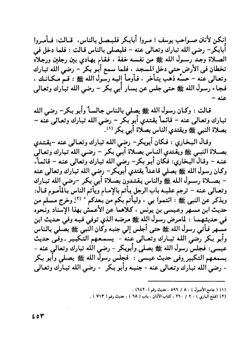 وقال البخاري: فكان أبو بكر- رضي اللَّه تبارك وتعالى عنه- يقتدي بصلاة النبي صلى اللَّه عليه وسلم ويقتدي الناس بصلاة أبي بكر- رضي اللَّه تبارك وتعالى عنه- وقال البخاري: فكان أبو بكر- رضي اللَّه تبارك وتعالى عنه- قائما، وكان رسول اللَّه صلى اللَّه عليه وسلم يصلي قاعدا يقتدي أبو بكر- رضي اللَّه تبارك وتعالى عنه- بصلاة رسول اللَّه صلى اللَّه عليه وسلم والناس يقتدون بصلاة أبي بكر- رضي اللَّه تبارك وتعالى عنه- ترجم عليه باب الرجل يأتم بالإمام ويأتم الناس بالمأموم