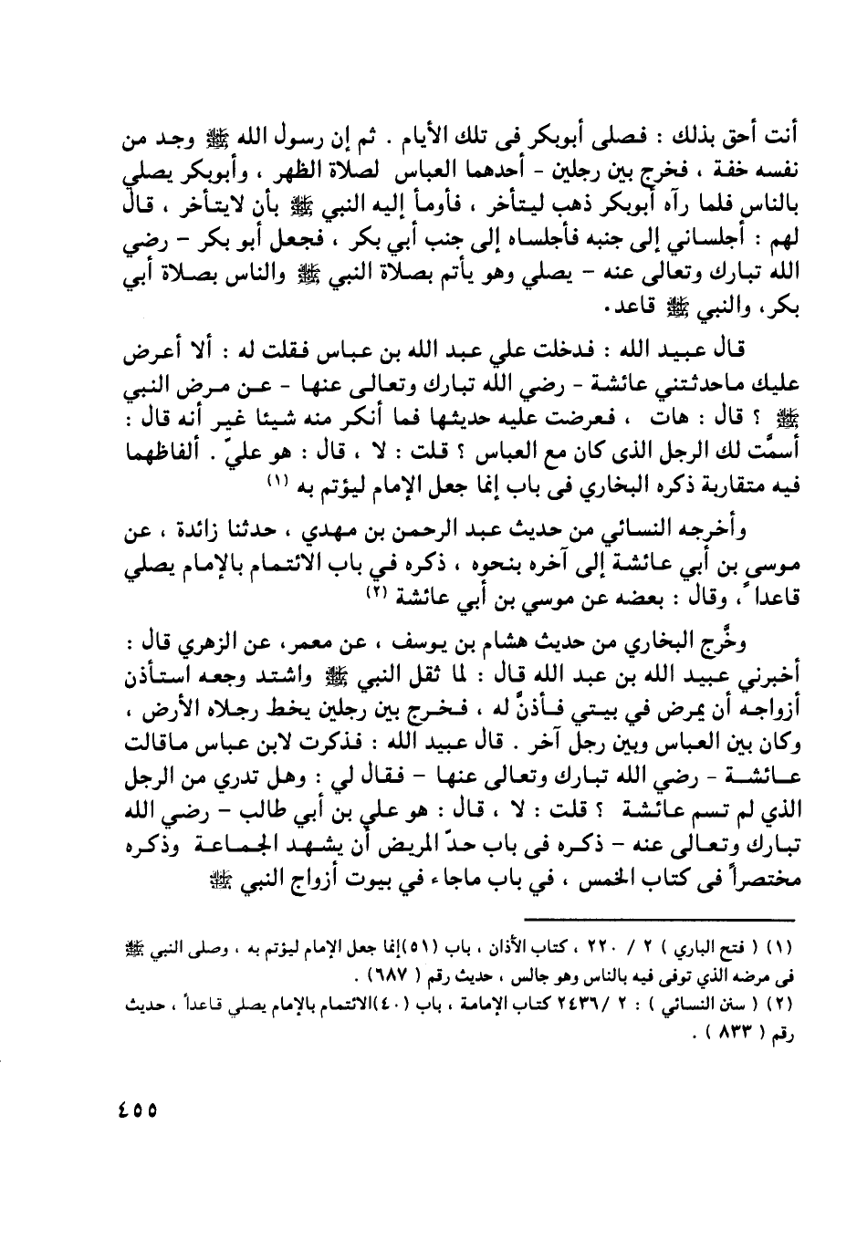 [ (1) ] (فتح الباري) : 2/ 220، كتاب الأذان، باب (51) إنما جعل الإمام ليؤتم به، وصلى النبي صلى اللَّه عليه وسلم في مرضه الّذي توفى فيه بالناس وهو جالس، حديث رقم (687) .