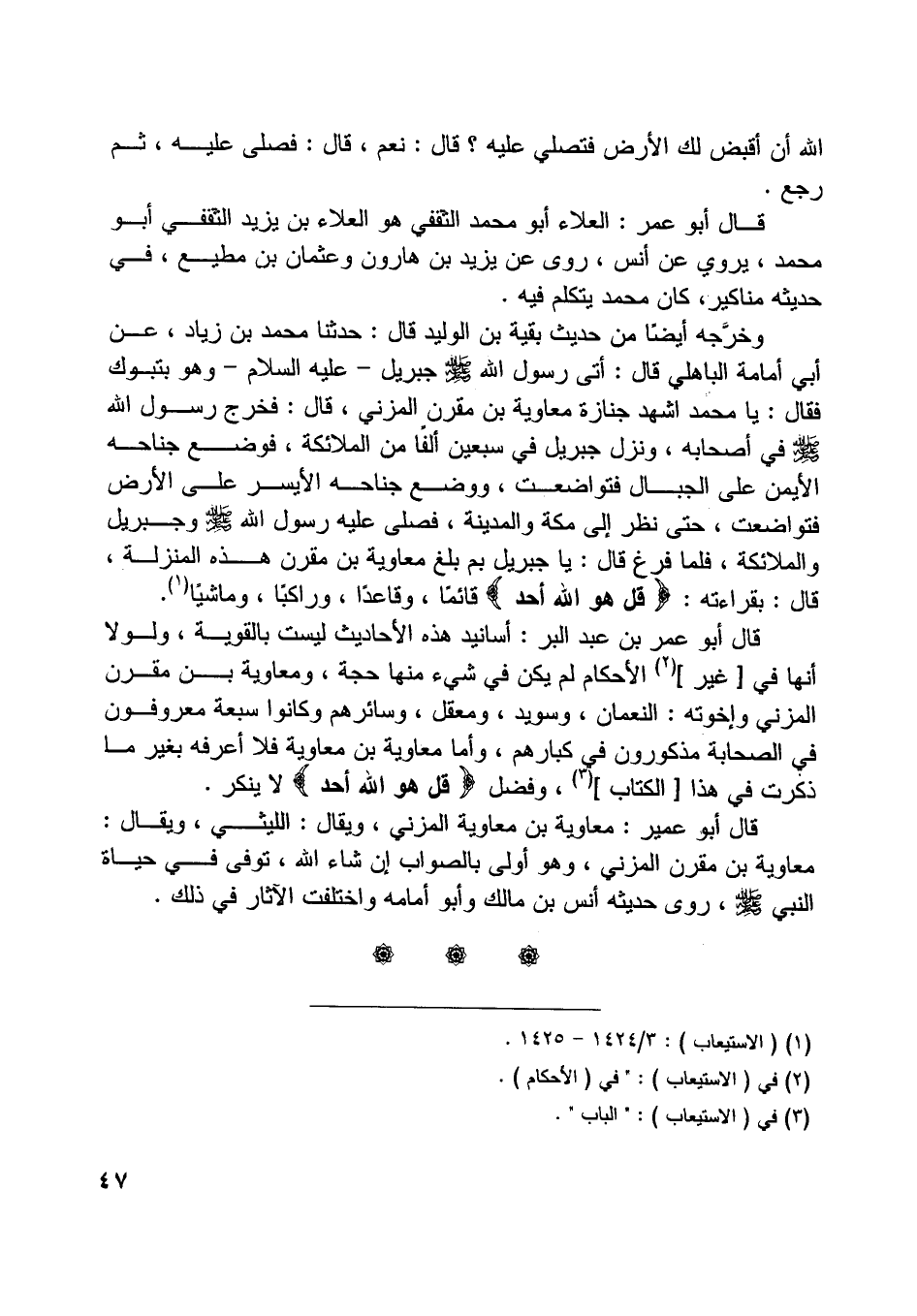 قال أبو عمر بن عبد البر: أسانيد هذه الأحاديث ليست بالقوية، ولولا أنها في [غير] [ (2) ] الأحكام لم يكن في شيء منها حجة، ومعاوية بن مقرن المزني وإخوته: النعمان، وسويد، ومعقل، وسائرهم وكانوا سبعة معروفون في الصحابة مذكورون في كبارهم، وأما معاوية بن معاوية فلا أعرفه بغير ما ذكرت في هذا [الكتاب] [ (3) ] ، وفضل قُلْ هُوَ اللَّهُ أَحَدٌ لا ينكر.