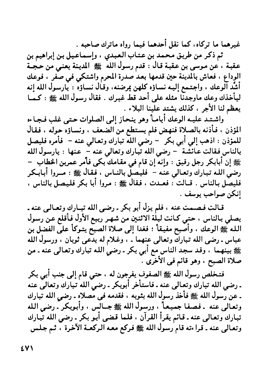 واشتد عليه الوعك أياما وهو ينحاز إلى الصلوات حتى غلب فجاءه المؤذن، فأذنه بالصلاة فنهض فلم يستطع من الضعف، ونساؤه حوله، فقال للمؤذن: اذهب إلي أبي بكر- رضي اللَّه تبارك وتعالى عنه- فأمره فليصل بالناس فقالت عائشة- رضي اللَّه تبارك وتعالى عنه- عنها: يا رسول اللَّه صلى اللَّه عليه وسلم إن أبا بكر رجل رقيق: وإنه إن قام في مقامك بكى فأمر عمر بن الخطاب- رضي اللَّه تبارك وتعالى عنه- فليصل بالناس، فقال صلى اللَّه عليه وسلم: مروا أبا بكر فليصل بالناس. قالت: فعدت، فقال صلى اللَّه عليه وسلم: مروا أبا بكر فليصل بالناس، إنكن صواحب يوسف.