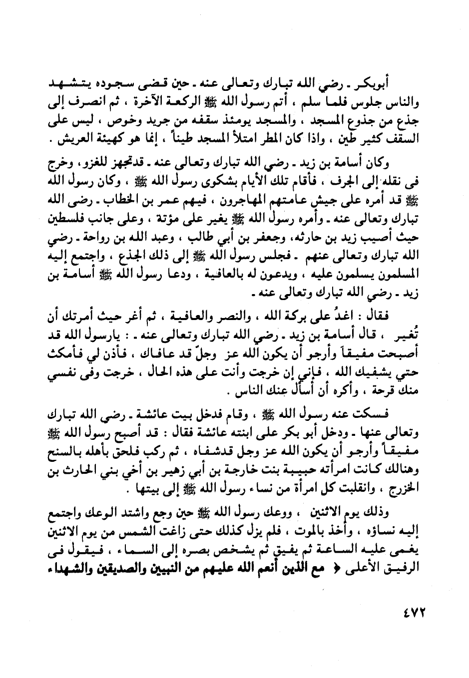 فقال: أغد على بركة اللَّه، والنصر والعافية، ثم أغر حيث أمرتك أن تغير، قال أسامة بن زيد- رضي اللَّه تبارك وتعالى عنه-: يا رسول اللَّه قد أصبحت مفيقا وأرجو أن يكون اللَّه عز وجلّ قد عافاك، فأذن لي فأمكث حتى يشفيك اللَّه، فإنّي إن خرجت وأنت على هذه الحال، خرجت وفي نفسي منك قرحة، وأكره أن أسأل عنك الناس.