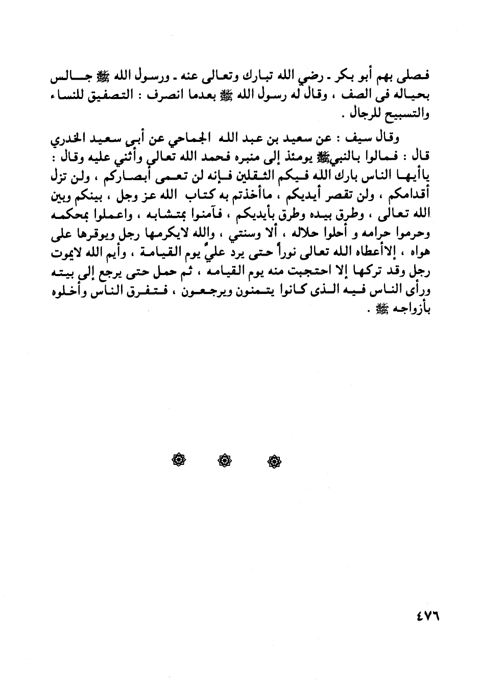 فصلى بهم أبو بكر- رضي اللَّه تبارك وتعالى عنه- ورسول اللَّه صلى اللَّه عليه وسلم جالس بحياله في الصف، وقال له رسول اللَّه صلى اللَّه عليه وسلم بعد ما انصرف: التصفيق للنساء والتسبيح للرجال.