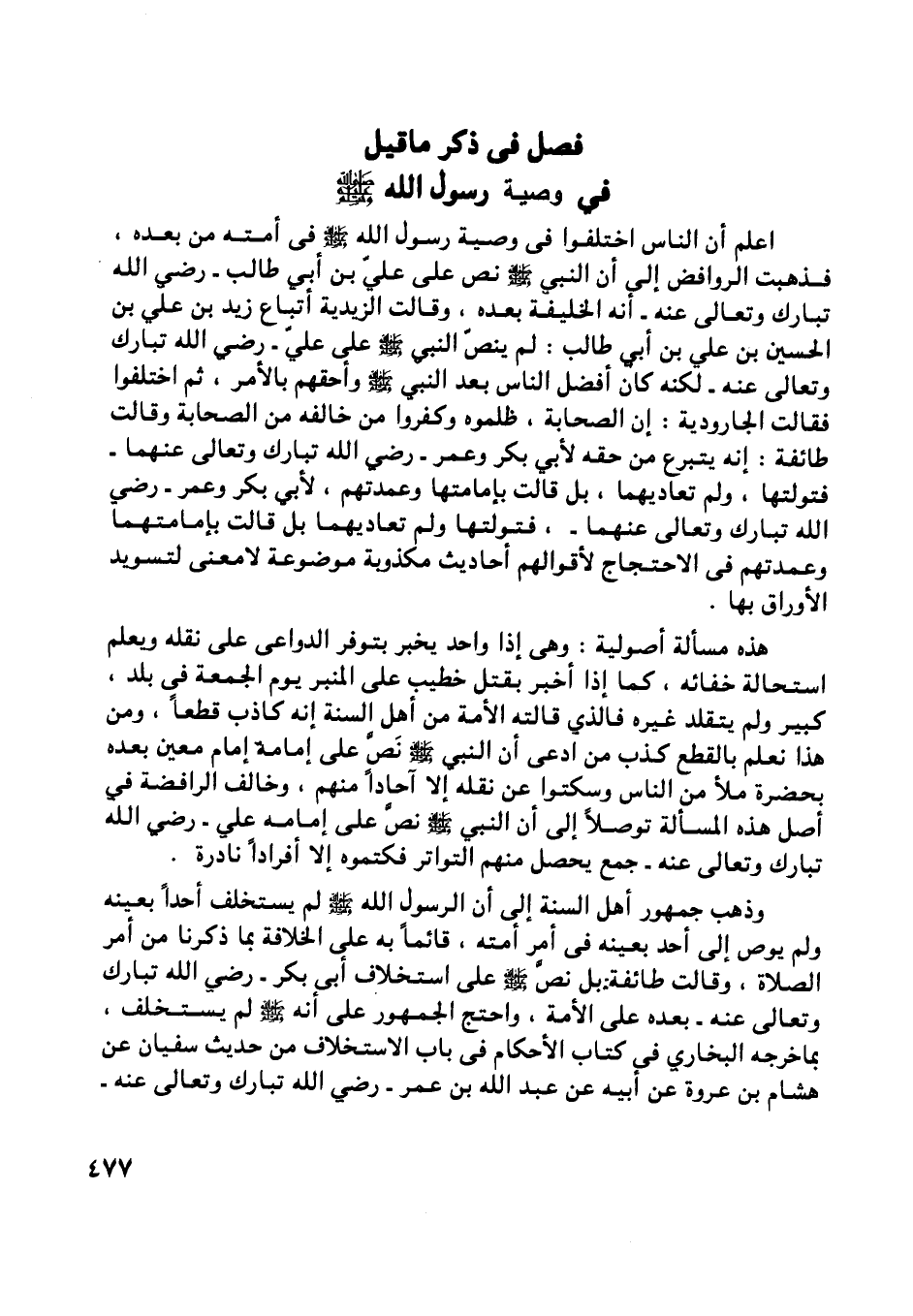 اعلم أن الناس اختلفوا في وصية رسول اللَّه صلى اللَّه عليه وسلم في أمته من بعده، فذهبت الروافض إلى أن النبي صلى اللَّه عليه وسلم نص على عليّ بن أبي طالب- رضي اللَّه تبارك وتعالى عنه- أنه الخليفة بعده، وقالت الزيدية أتباع زيد بن علي بن الحسين بن علي بن أبي طالب: لم ينصّ النبي صلى اللَّه عليه وسلم على عليّ- رضي اللَّه تبارك وتعالى عنه- لكنه كان أفضل الناس بعد النبي صلى اللَّه عليه وسلم وأحقهم بالأمر، ثم اختلفوا فقالت الجارودية: إن الصحابة، ظلموه وكفروا من خالفه من الصحابة وقالت طائفة: إنه يتبرع من حقه لأبي بكر وعمر- رضي اللَّه تبارك وتعالى عنهما- فتولتها، ولم تعاديهما، بل قالت بإمامتها وعمدتهم، لأبي بكر وعمر- رضي اللَّه تبارك وتعالى عنهما-، فتولتها ولم تعاديهما بل قالت بإمامتهما وعمدتهم في الاحتجاج لأقوالهم أحاديث مكذوبة موضوعة لا معنى لتسويد الأوراق بها.
