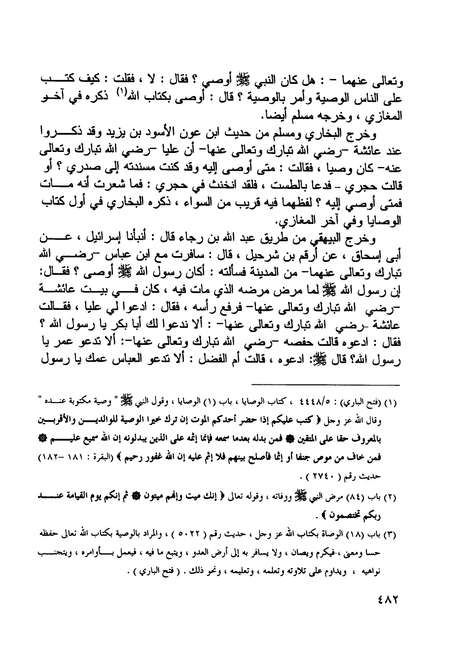 [ (1) ] (فتح الباري) : 5/ 4448، كتاب الوصايا، باب (1) الوصايا، وقول النبي صلى اللَّه عليه وسلم «وصية مكتوبة عنده» وقال اللَّه عز وجل كُتِبَ عَلَيْكُمْ إِذا حَضَرَ أَحَدَكُمُ الْمَوْتُ إِنْ تَرَكَ خَيْراً الْوَصِيَّةُ لِلْوالِدَيْنِ وَالْأَقْرَبِينَ بِالْمَعْرُوفِ حَقًّا عَلَى الْمُتَّقِينَ* فَمَنْ بَدَّلَهُ بَعْدَ ما سَمِعَهُ فَإِنَّما إِثْمُهُ عَلَى الَّذِينَ يُبَدِّلُونَهُ إِنَّ اللَّهَ سَمِيعٌ عَلِيمٌ* فَمَنْ خافَ مِنْ مُوصٍ جَنَفاً أَوْ إِثْماً فَأَصْلَحَ بَيْنَهُمْ فَلا إِثْمَ عَلَيْهِ إِنَّ اللَّهَ غَفُورٌ رَحِيمٌ (البقرة: 181- 182) حديث رقم (2740) .