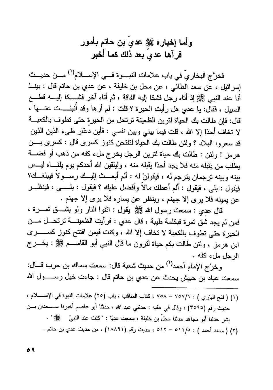 فخرّج البخاريّ في باب علامات النبوة في الإسلام [ (1) ] من حديث إسرائيل، عن سعد الطائي، عن محل بن خليفة، عن عدي بن حاتم قال: بينا أنا عند النبي صلّى اللَّه عليه وسلّم إذ أتاه رجل فشكا إليه الفاقة، ثم أتاه آخر فشكا إليه قطع السبيل، فقال: يا عدي هل رأيت الحيرة؟ قلت: لم أرها وقد أنبئت عنها، قال: فإن طالت بك الحياة لترين الظعينة ترتحل من الحيرة حتى تطوف بالكعبة لا تخاف أحدا إلا اللَّه، قلت فيما بيني وبين نفسي: فأين دعّار طيِّئ الذين الذين قد سعروا البلاد؟ ولئن طالت بك الحياة لتفتحن كنوز كسرى قال: كسرى بن هرمز! ولئن: طالت بك حياة لترين الرجل يخرج ملء كفه من ذهب أو فضة يطلب من يقبله منه فلا يجد أحدا يقبله منه، وليلقين اللَّه أحدكم يوم يلقاه ليس بينه وبين ترجمان يترجم له، فيقولنّ له: ألم أبعث إليك رسولا فيبلغك؟