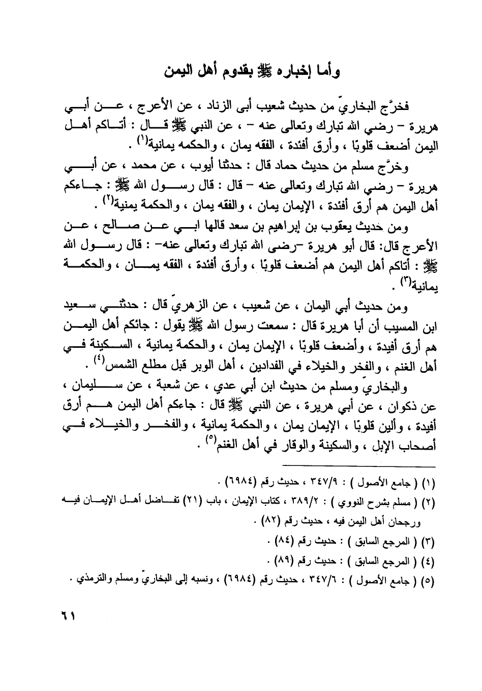 وخرّج مسلم من حديث حماد قال: حدثنا أيوب، عن محمد، عن أبي هريرة- رضي اللَّه تبارك وتعالى عنه- قال: قال رسول اللَّه صلّى اللَّه عليه وسلّم: جاءكم أهل اليمن هم أرق أفئدة، الإيمان يمان، والفقه يمان، والحكمة يمنية [ (2) ] .