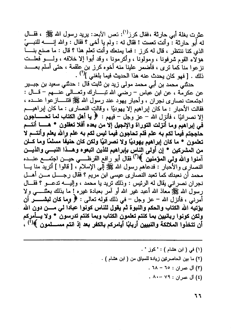 اجتمعت نصارى نجران، وأحبار يهود عند رسول اللَّه صلّى اللَّه عليه وسلّم فتنازعوا عنده، فقالت الأحبار: ما كان إبراهيم إلا يهوديا، وقالت النصارى، ما كان إبراهيم إلا نصرانيا، فأنزل اللَّه- عز وجل- فيهم: يا أَهْلَ الْكِتابِ لِمَ تُحَاجُّونَ فِي إِبْراهِيمَ وَما أُنْزِلَتِ التَّوْراةُ وَالْإِنْجِيلُ إِلَّا مِنْ بَعْدِهِ أَفَلا تَعْقِلُونَ* ها أَنْتُمْ هؤُلاءِ حاجَجْتُمْ فِيما لَكُمْ بِهِ عِلْمٌ فَلِمَ تُحَاجُّونَ فِيما لَيْسَ لَكُمْ بِهِ عِلْمٌ وَاللَّهُ يَعْلَمُ وَأَنْتُمْ لا تَعْلَمُونَ* ما كانَ إِبْراهِيمُ يَهُودِيًّا وَلا نَصْرانِيًّا وَلكِنْ كانَ حَنِيفاً مُسْلِماً وَما كانَ مِنَ الْمُشْرِكِينَ* إِنَّ أَوْلَى النَّاسِ بِإِبْراهِيمَ لَلَّذِينَ اتَّبَعُوهُ وَهذَا النَّبِيُّ وَالَّذِينَ آمَنُوا وَاللَّهُ وَلِيُّ الْمُؤْمِنِينَ [ (3) ]