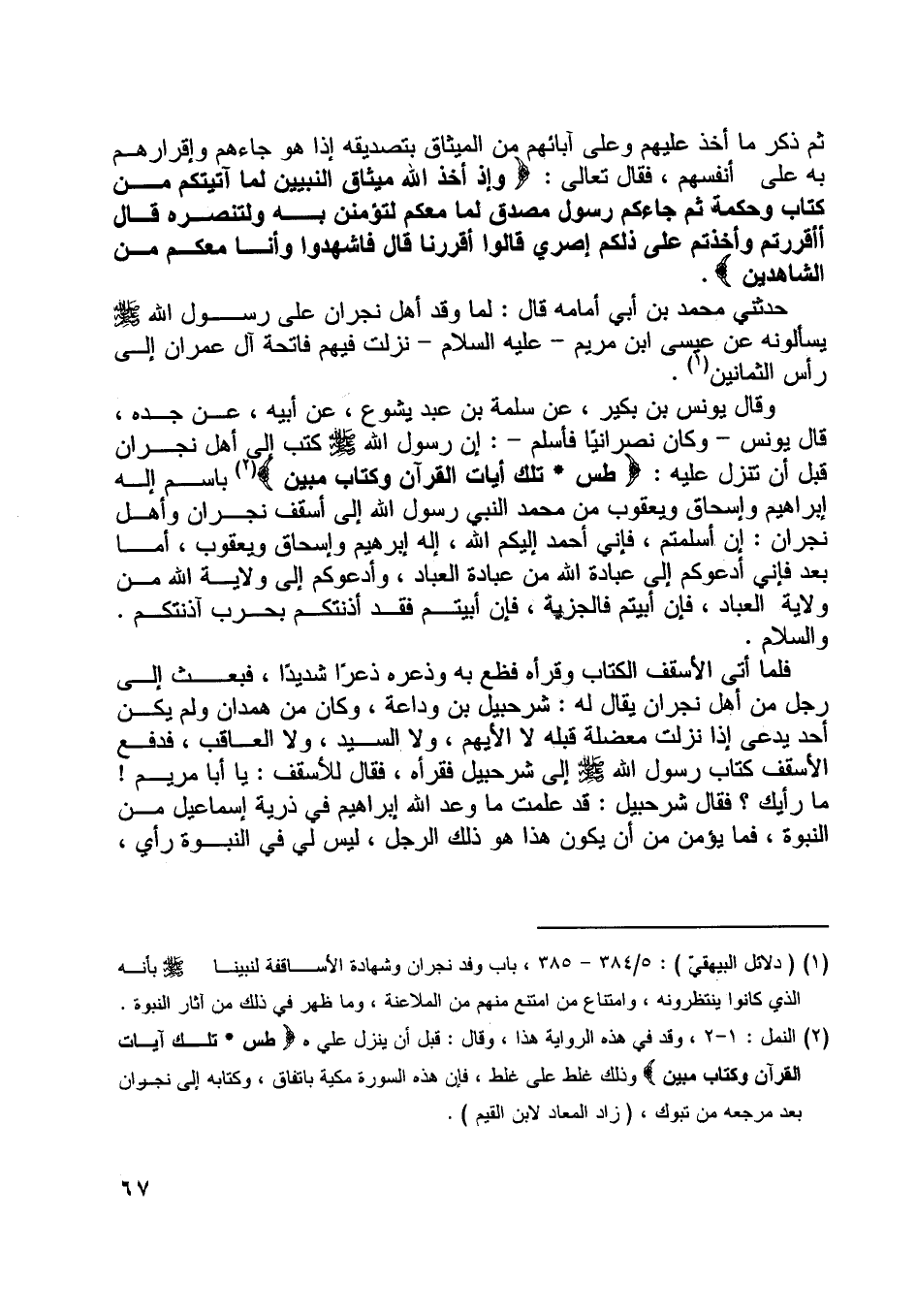[ (2) ] النمل: 1- 2، وقد في هذه الرواية هذا، وقال: قبل أن ينزل علي. طس* تِلْكَ آياتُ الْقُرْآنِ وَكِتابٍ مُبِينٍ وذلك غلط على غلط، فإن هذه السورة مكية باتفاق، وكتابه إلى نجران بعد مرجعه من تبوك، (زاد المعاد لابن القيم) .