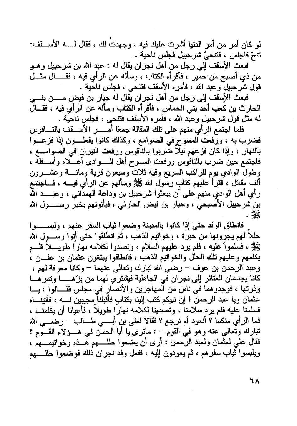 فانطلق الوفد حتى إذا كانوا بالمدينة وضعوا ثياب السفر عنهم، ولبسوا حللا لهم يجرونها من حبرة، وخواتيم الذهب، ثم انطلقوا حتى أتوا رسول اللَّه صلّى اللَّه عليه وسلّم، فسلموا عليه، فلم يرد عليهم السلام، وتصدوا لكلامه نهارا طويلا فلم يكلمهم وعليهم تلك الحال والخواتيم الذهب، فانطلقوا يبتغون عثمان بن عفان، وعبد الرحمن بن عوف- رضي اللَّه تبارك وتعالى عنهما- وكانا معرفة لهم، كانا يجدعان العتائر إلى نجران في الجاهلية فيشتري لهما من بزّها وتمرها وذرتها، فوجدوهما في ناس من المهاجرين والأنصار في مجلس