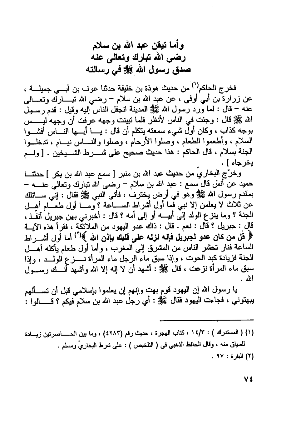 وأما تيقن عبد اللَّه بن سلام رضي اللَّه تبارك وتعالى عنه صدق رسول اللَّه صلّى اللَّه عليه وسلّم في رسالته