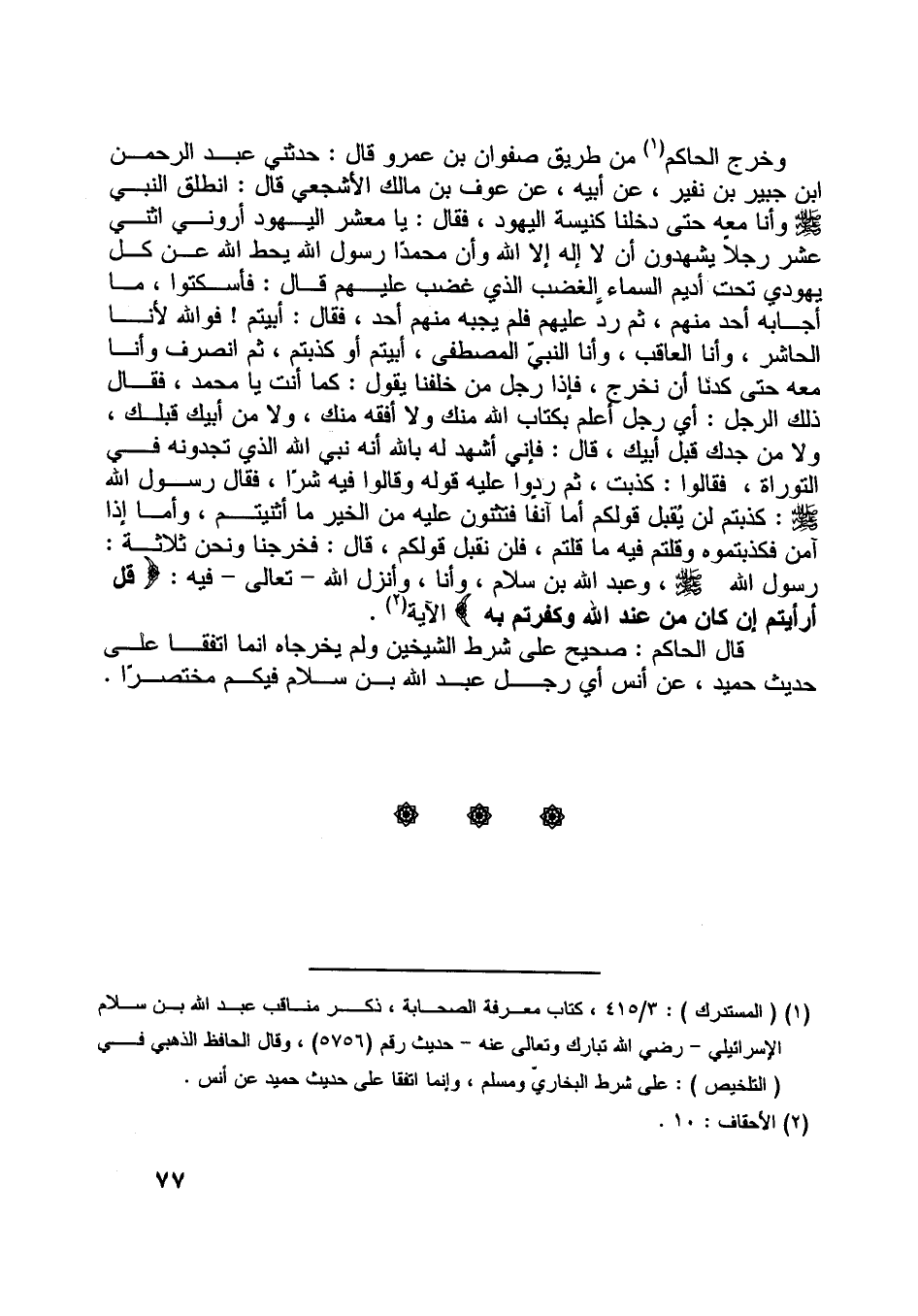 [ (1) ] (المستدرك) : 3/ 415، كتاب معرفة الصحابة، ذكر مناقب عبد اللَّه بن سلام الإسرائيلي- رضي اللَّه تبارك وتعالى عنه- حديث رقم (5756) ، وقال الحافظ الذهبي في (التلخيص) : على شرط البخاريّ ومسلم، وإنما اتفقا على حديث حميد عن أنس.