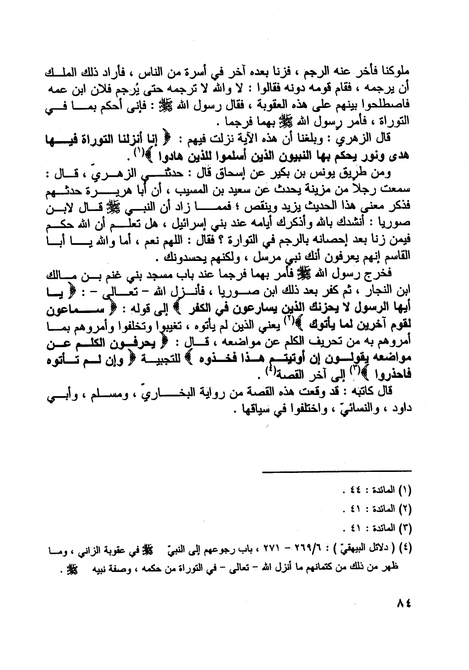 [ (4) ] (دلائل البيهقيّ) : 6/ 269- 271، باب رجوعهم إلى النبيّ صلّى اللَّه عليه وسلّم في عقوبة الزاني، وما ظهر من ذلك من كتمانهم ما أنزل اللَّه- تعالى- في التوراة من حكمه، وصفة نبيه صلّى اللَّه عليه وسلّم.