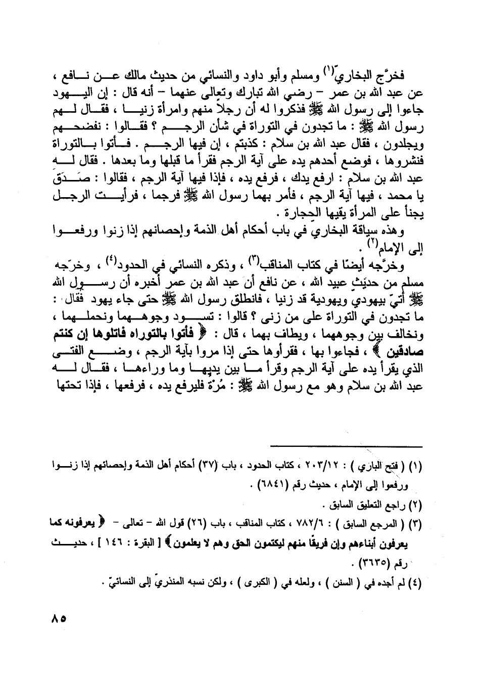 فخرّج البخاريّ [ (1) ] ومسلم وأبو داود والنسائي من حديث مالك عن نافع، عن عبد اللَّه بن عمر- رضي اللَّه تبارك وتعالى عنهما- أنه قال: إن اليهود جاءوا إلى رسول اللَّه صلّى اللَّه عليه وسلّم فذكروا له أن رجلا منهم وامرأة زنيا، فقال لهم رسول اللَّه صلّى اللَّه عليه وسلّم: ما تجدون في التوراة في شأن الرجم؟ فقالوا: نفضحهم ويجلدون، فقال عبد اللَّه بن سلام: كذبتم، إن فيها الرجم. فأتوا بالتوراة فنشروها، فوضع أحدهم يده على آية الرجم فقرأ ما قبلها وما بعدها. فقال له عبد اللَّه بن سلام: ارفع يدك، فرفع يده، فإذا فيها آية الرجم، فقالوا: صدق يا محمد، فيها آية الرجم، فأمر بهما رسول اللَّه صلّى اللَّه عليه وسلّم فرجما، فرأيت الرجل يجنأ على المرأة يقيها الحجارة.