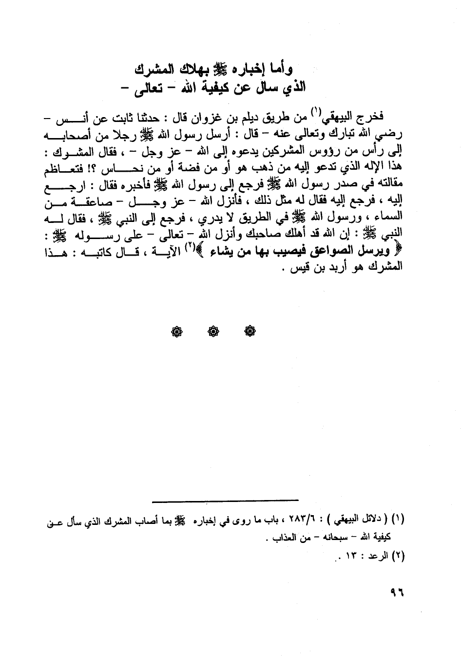 [ (1) ] (دلائل البيهقي) : 6/ 283، باب ما روى في إخباره صلّى اللَّه عليه وسلّم بما أصاب المشرك الّذي سأل عن كيفية اللَّه- سبحانه- من العذاب.