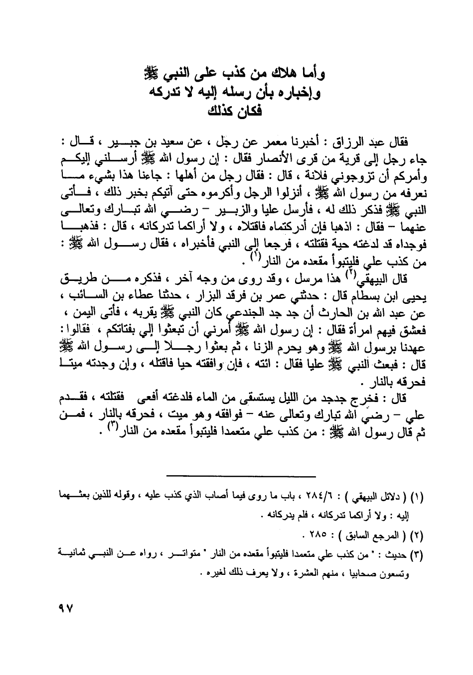 [ (1) ] (دلائل البيهقي) : 6/ 284، باب ما روى فيما أصاب الّذي كذب عليه، وقوله للذين بعثهما إليه: ولا أراكما تدركانه، فلم يدركانه.