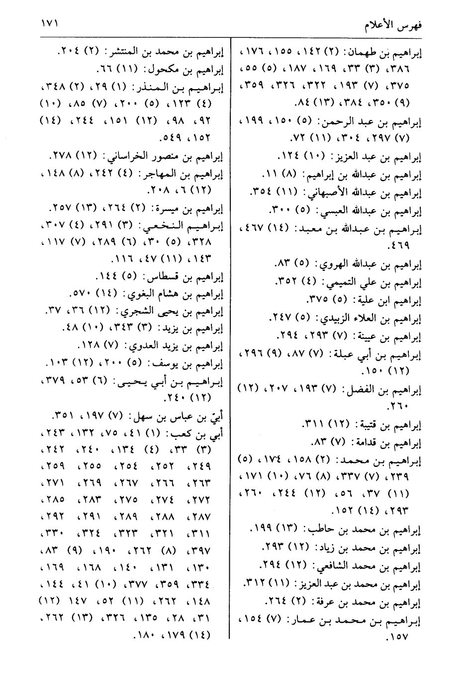إبراهيم بن طهمان: (2) 142، 155، 176، 386، (3) 33، 169، 187، (5) 55، 375، (7) 193، 322، 326، 359، (9) 350، 384، (13) 84.