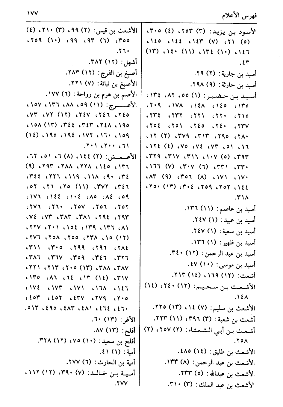 الأشعث بن عبد الملك: (3) 310. الأشعث بن قيس: (2) 99، (3) 210، (4) 355، (6) 93، 99، (10) 259، 260.