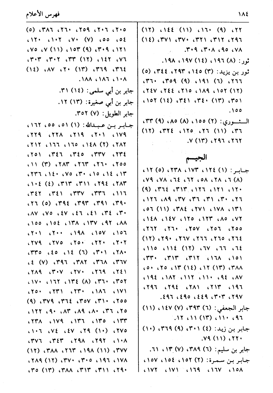 الجيم جابر: (1) 124، 173، 238، (5) 12، (8) 6، 28، 58، 62، 64، 78، 79، 120، 121، 126، 313، 364، (9) 26، 30، 31، 36، 37، 89، 126، 131، 178، 271، 384، (11) 56، 72، 85، 123، 125، 147، 148، 255، 256، 257، 260، 262، 264، 265، 266، 267، 290، (12) 64، 66، 67، (12) 114، 115، 151، 168، 312، 313، 330، 388، (13) 12، (14) 13، 25، 50، 87، 94، 110، 112، 182، 194، 196، 213، 281، 294، 296، 297، 303، 449، 495، 496.