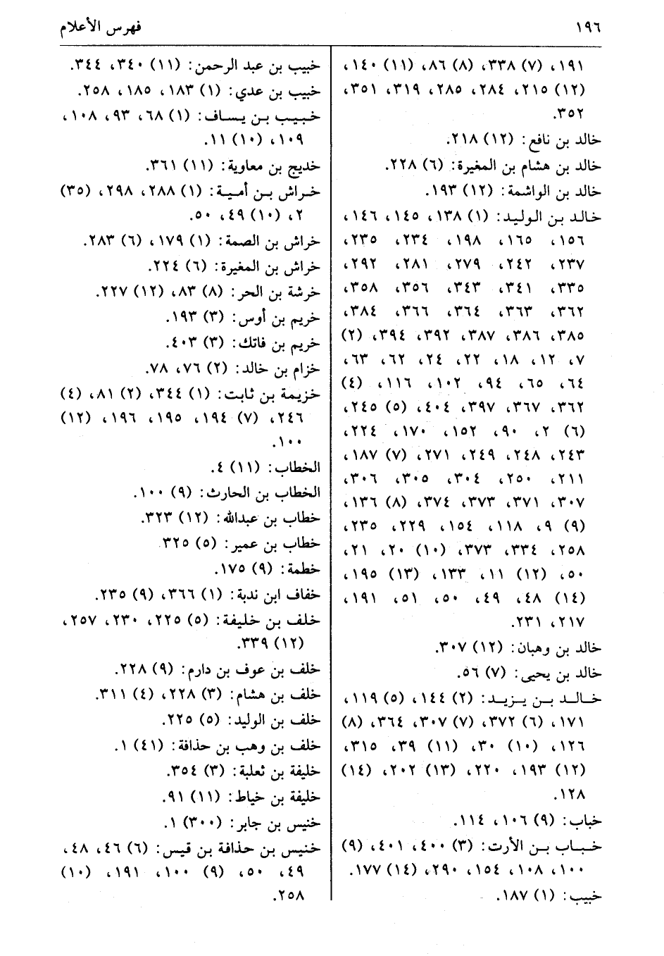 خالد بن الوليد: (1) 138، 145، 146، 156، 165، 198، 234، 235، 237، 242، 279، 281، 292، 335، 341، 343، 356، 358، 362، 363، 364، 366، 384، 385، 386، 387، 392، 394، (2) 7، 12، 18، 22، 24، 62، 63، 64، 65، 94، 102، 116، (4) 362، 367، 397، 404، (5) 245، (6) 2، 90، 152، 170، 224، 243، 248، 249، 271، (7) 187، 211، 250، 304، 305، 306، 307، 371، 373، 374، (8) 136، (9) 9، 118، 154، 229، 235، 258، 334، 373، (10) 20، 21، 50، (12) 11، 133، (13) 195، (14) 48، 49، 50، 51، 191، 217، 231.
