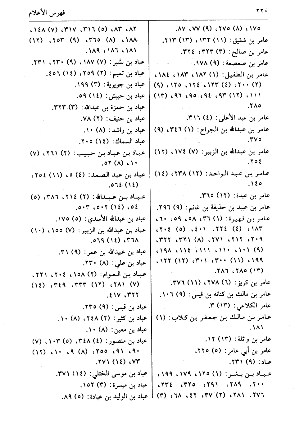 عباد بن بشر: (1) 125، 179، 199، 200، 289، 291، 325، 234، 276، 281، (2) 37، 42، 68، (3) 82، 83، (5) 316، 317، (7) 148، 188، (8) 365، (9) 253، (12) 181، 186، 189.