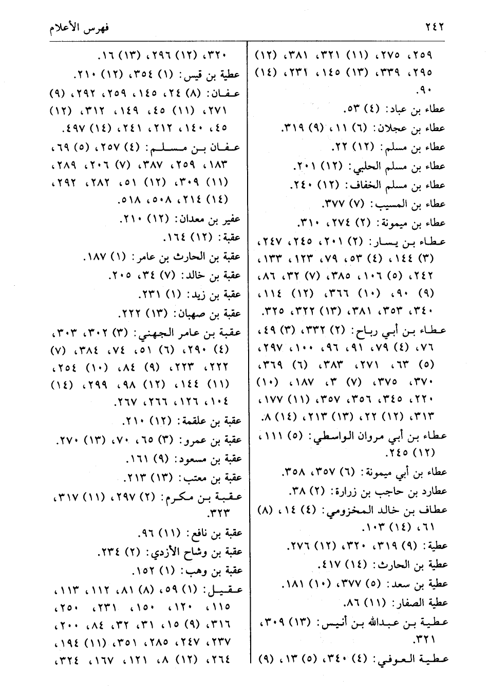 عطاء بن أبي رباح: (2) 332، (3) 49، 76، (4) 79، 91، 96، 100، 297، (5) 63، 271، 383، (6) 369، 370، 375، (7) 3، 187، (10) 220، 345، 356، 357، (11) 177، 313، (12) 22، (13) 213، (14) 8.