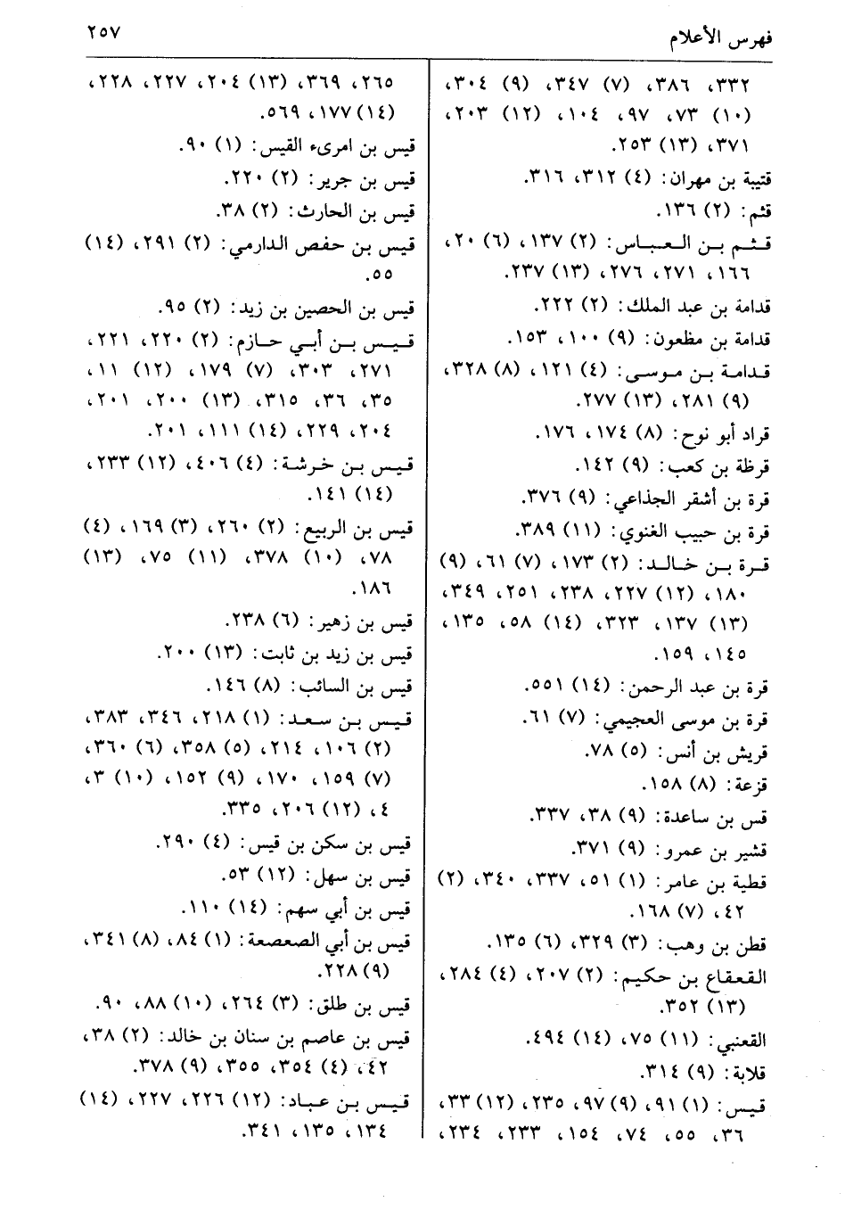 قيس: (1) 91، (9) 97، 235، (12) 33، 36، 55، 74، 154، 233، 234، 265، 369، (13) 204، 227، 228، (14) 177، 569.