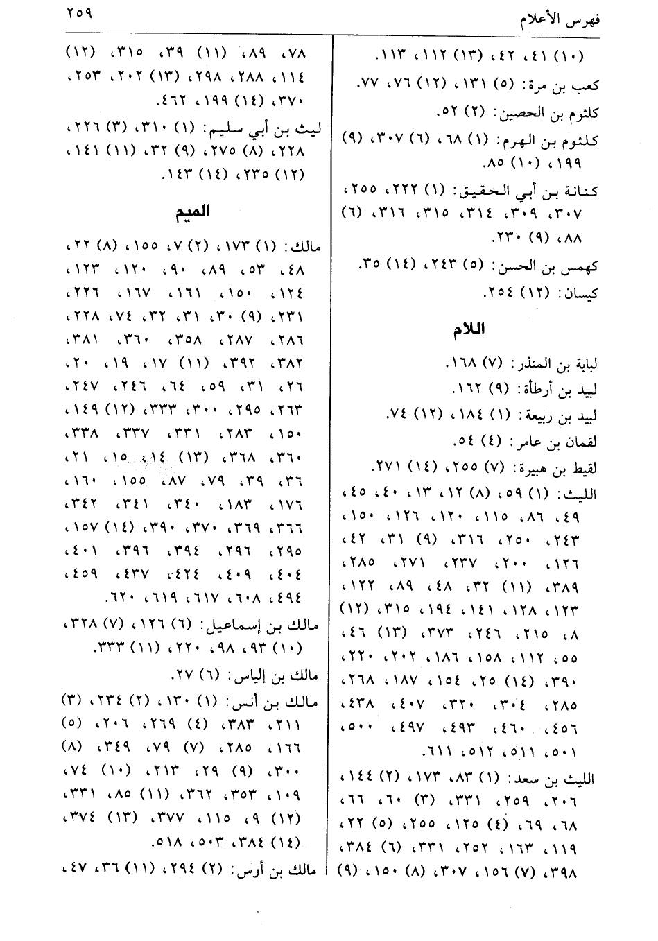 الليث: (1) 59، (8) 12، 13، 40، 45، 49، 86، 115، 120، 126، 150، 243، 250، 316، (9) 31، 42، 126، 200، 237، 271، 285، 389، (11) 32، 48، 89، 122، 123، 128، 141، 194، 315، (12) 8، 215، 246، 373، (13) 46، 55، 112، 158، 186، 202، 220، 390، (14) 25، 154، 187، 268، 285، 304، 320، 407، 438، 456، 460، 493، 497، 500، 501، 511، 512، 611.