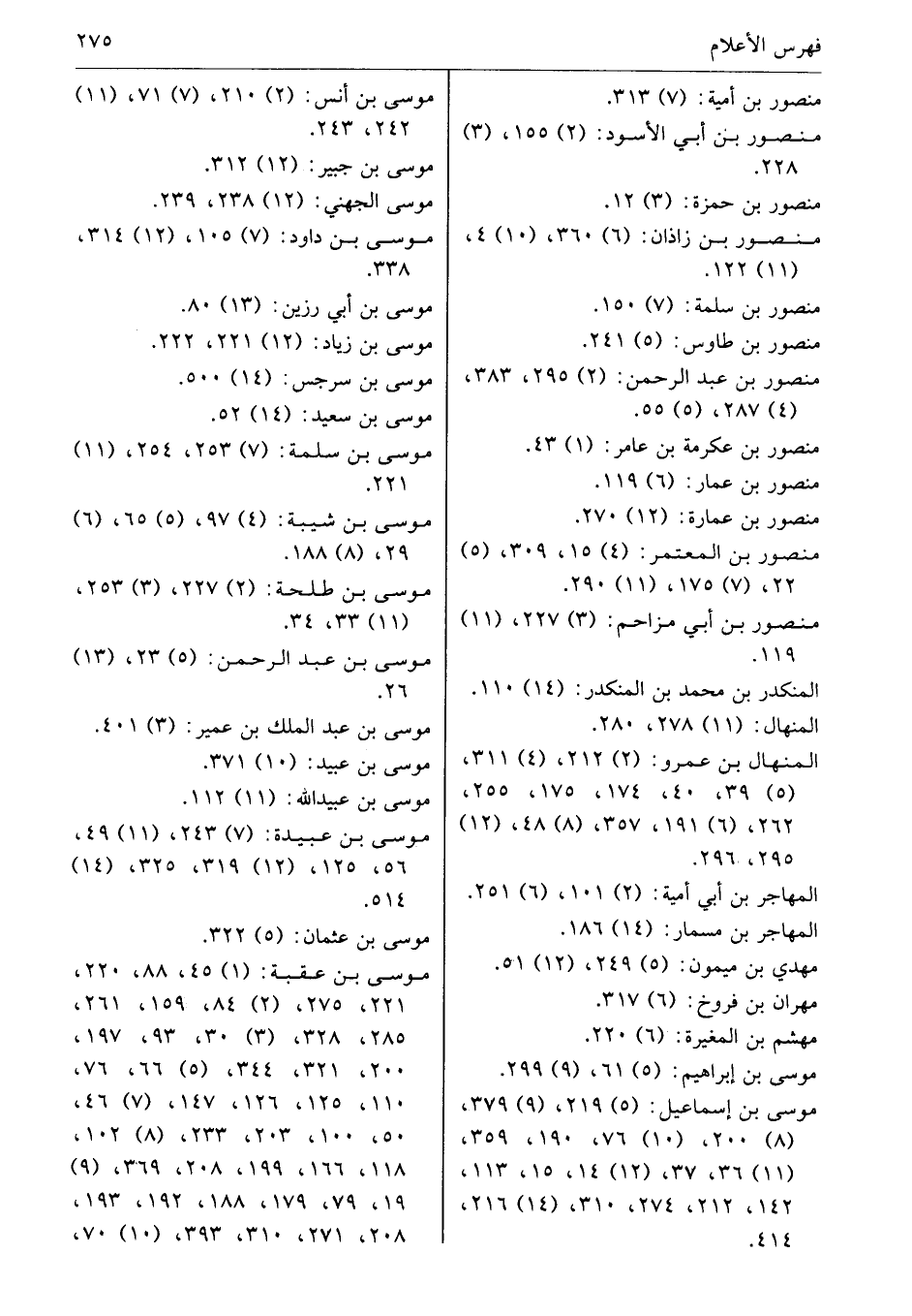 موسى بن إسماعيل: (5) 219، (9) 379، (8) 200، (10) 76، 190، 359، (11) 36، 37، (12) 14، 15، 113، 142، 212، 274، 310، (14) 216، 414. موسى بن أنس: (2) 210، (7) 71، (11) 242، 243.